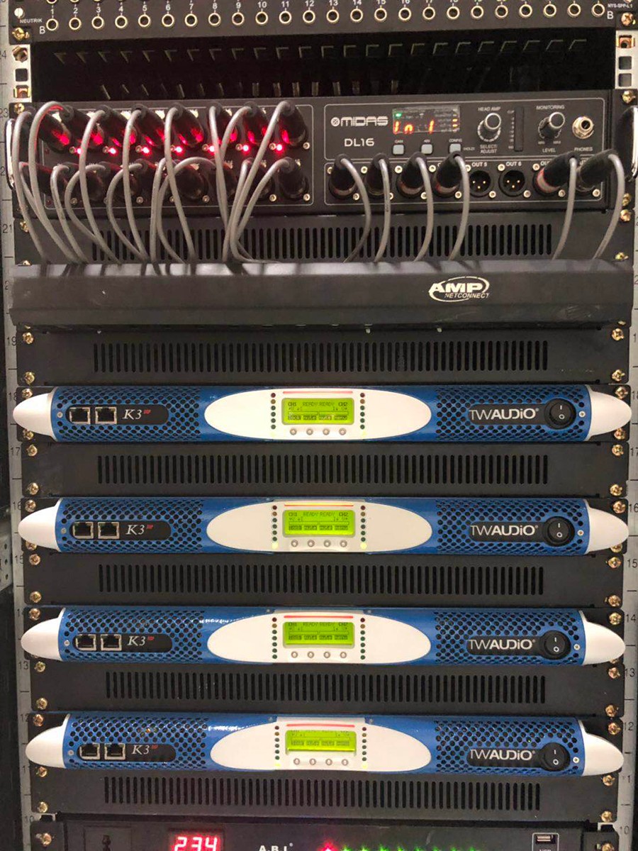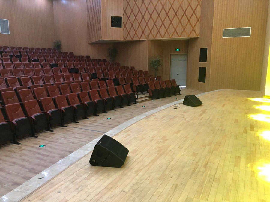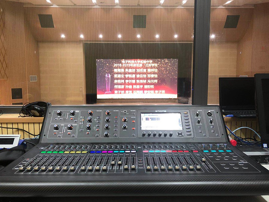 電子科技大學實驗中學劇場主擴聲系統(tǒng)采用6只90°的T20點聲源線陣列揚聲器打造,2只為一組分別吊掛在舞臺兩側和舞臺中央作為主擴聲,2只M12全頻音箱搭配2只B30超低放置在舞臺兩側作為前補聲以及低音補充,除此之外還有C12作為舞臺監(jiān)聽。整套系統(tǒng)由4臺K3DSP數(shù)字功放驅動。監(jiān)控室內(nèi)采用英國Midas M32數(shù)字調(diào)音臺以及DL16舞臺接口箱。